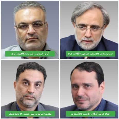 همچنین «مهدی اکبرپور» رئیس شعبه 18 دادگاه تجدیدنظر استان البرز و «جواد کریمزادگان» از کارکنان حوزه ریاست دادگستری کل استان البرز به ترتیب به عنوان قاضی و کارمند نمونه کشوری برگزیده شدند.
